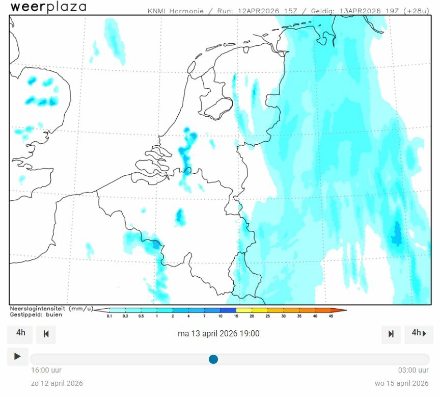 Morgenmiddag overheerst de bewolking en ontstaan er enkele buien. Langs de oostgrens kan plaatselijk lichte regen vallen. De maximumtemperatuur ligt rond 14°C. De wind is zwak tot matig en gaat geleidelijk uit een noordelijke richting waaien.