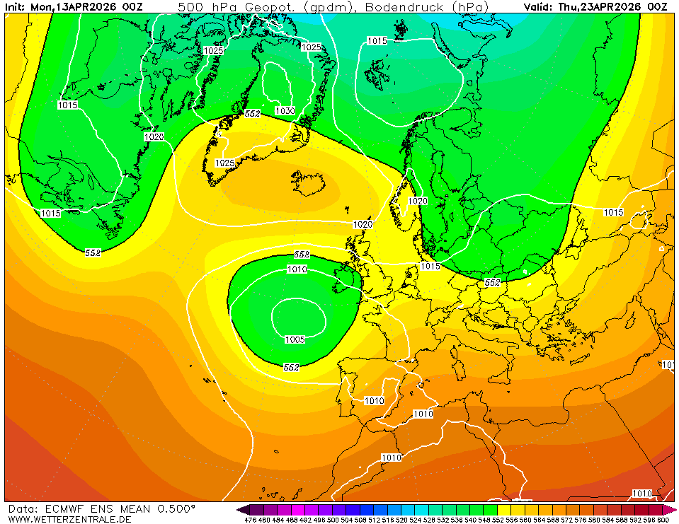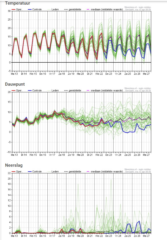 De oper van EC is een uitbijter, zoals te verwachten was. In het tweede deel van april wordt het moeilijk tot thermische hoogstandjes te komen omdat hogedruk zich in de regio IJsland en Groenland lijkt te gaan ophouden - zie ensemble EC op +240 uur. Dat is echt wel een trendbreuk, de afgelopen twee maanden domineerde daar en zeker wat westelijker richting Ellesmere vooral lagedruk. Het is natuurlijk nog steeds afwachten of het zo loopt, en verder zijn er in dat scenario altijd nog genoeg droge en zonnige opties mogelijk, hoewel met wat lagere dauwpunten.