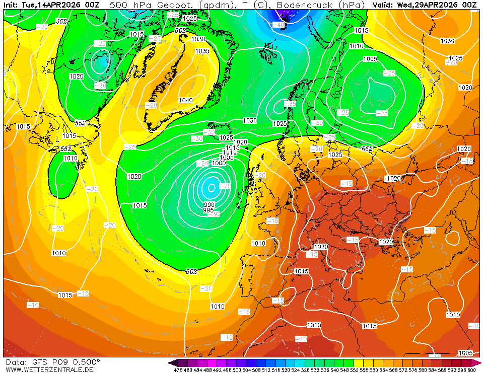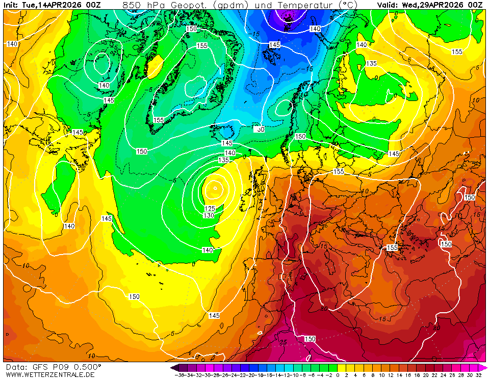 Lid 9 van het GEFS 00z van vandaag laat een Groenlandhoog zien die westelijk genoeg ligt zodat wij in de opgaande tak van de straalstroom terecht komen. En niet zo'n beetje ook! In de winter zijn dit op z'n zachtst uitgedrukt gruwelkaarten, maar in deze tijd van het jaar zullen er wel wat mensen zijn die hier op zitten te wachten.