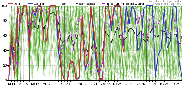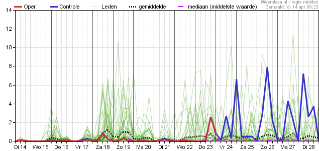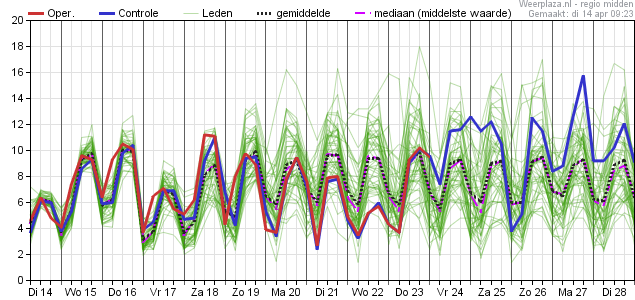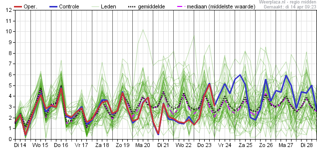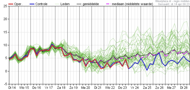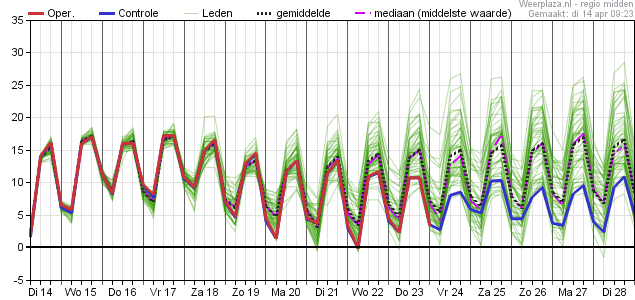 Kijkend naar de mediaan dan laat deze voor de periode zondag tot en met volgende week woensdag waarden zien van 13 a 14 graden.