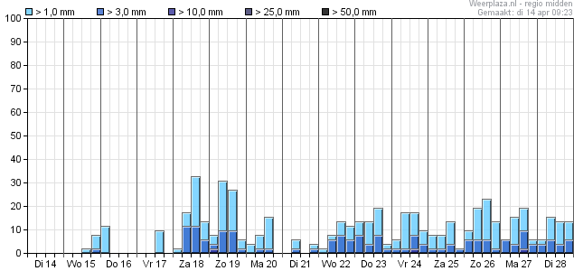 In het laatste deel van de pluim komt de mediaan dagelijks tot waarden boven de 14 graden, maar is de spreiding enorm.
