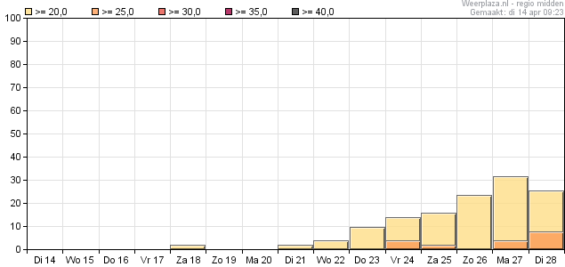 Pas vanaf volgende week dinsdag is er dagelijks een kans op een warme dag, die richting het einde van de periode steeds iets verder toeneemt.