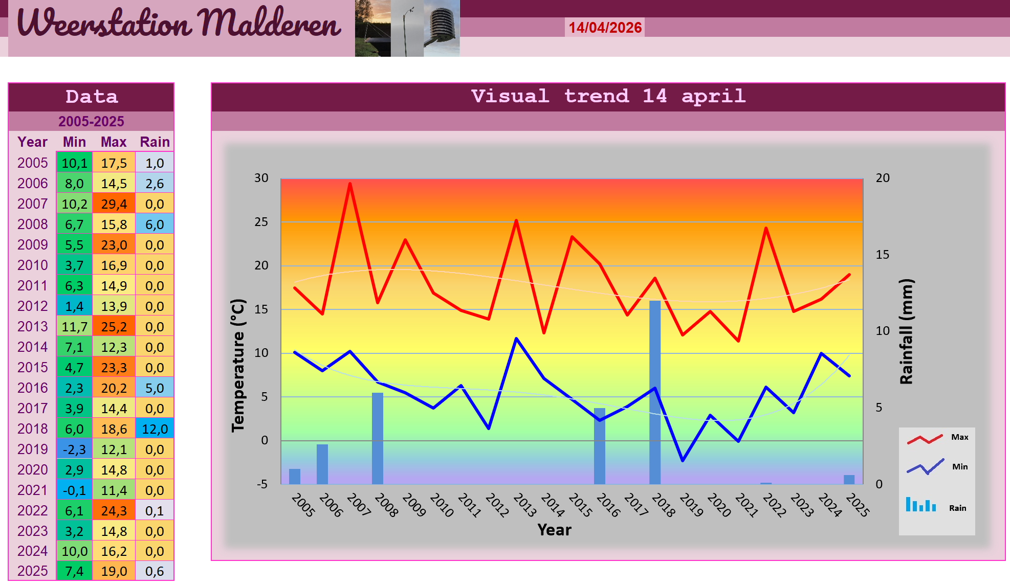 Het begin van de dag zag er veelbelovend uit toen het hardnekkige wolkendek dat ons vanochtend nog in haar greep hield, geleidelijk plaats maakte voor een luchtiger aandoende hemel waarin rond de middag diverse opklaringen hun intrede deden. Maar de lentepret was slechts van korte duur want al snel werd alles vanuit het westen weer hermetisch afgesloten terwijl de eerste regendruppels niet lang op zich lieten wachten. Tijdens de avonduurtjes viel het natte goedje aan een behoorlijk tempo in de Malderse pluviometer, waardoor we uitkwamen op 2,6 mm toen kort na zonsondergang de eerste opklaringen weer vanuit het noorden kwamen opdagen. Tegelijk kwam ook koelere lucht opzetten wat zich vertaalde in de temperaturen die in de namiddag nog 14,5 graden haalden maar bij zonsondergang reeds waren ingekrompen naar een achttal graden, waarbij we de minima wellicht rond middernacht zullen bereiken. Naast de regen liet ook de noordwestelijke wind zich goed voelen met snelheden tot 31 km/h al viel dit nog aardig mee in vergelijking met gisteren. Hoe bedrieglijk mooi de noordelijke opklaringen er ook mogen uitzien, vanuit het zuidwesten is reeds een erg actieve randstoring onderweg richting Malderen waardoor ook morgen een enigszins verwaterde dag dreigt te worden. De vooruitzichten voor zondag zijn eveneens aan de vochtige kant.