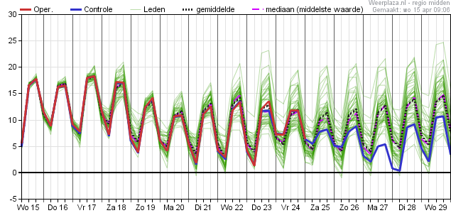 De mediaan ligt tussen de 10 en 12 graden om pas in de laatste dagen weer wat op te lopen tot een graad of 14.