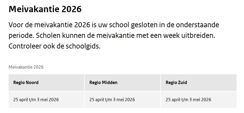 Denk dat Robert daarmee een week later dan het door DPG vermelde "aanstaande vrijdag" bedoelde. Hoewel deze vervroeging van de meivakantie beter hernoemd kan worden tot aprilvakantie. De meivakanties van mijn schooltijd hadden altijd 4 & 5 mei inbegrepen. Tegenwoordig zijn de kinderen op die dagen alweer naar school en is de belangrijkste feestdag in het jaar (5 mei) gewoon een lesdag?
