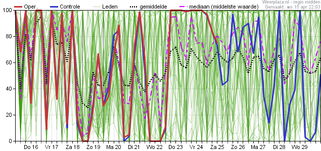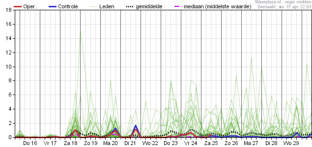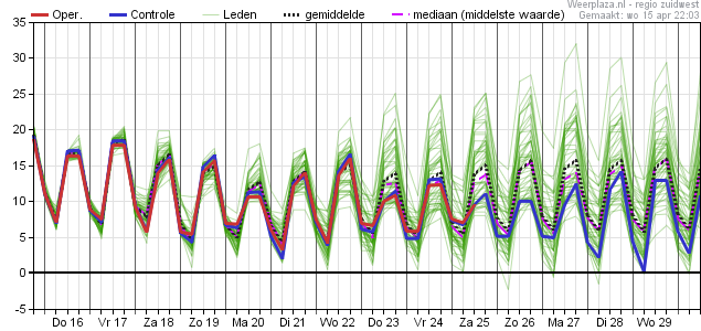 Ook hier in het (zuid)westen nog een week lang rond of boven de 15 graden. Vandaag thuis in Vlaardingen voor de 3e dag deze maand (nipt) de 20 graden aangetikt, en de laatste dag onder de 15 graden is al bijna twee weken geleden (3 april). Ter vergelijking, het langjarig gemiddelde in de eerste helft van april schommelt zo rond de 13-14 graden (inclusief iets aan tuineffect).