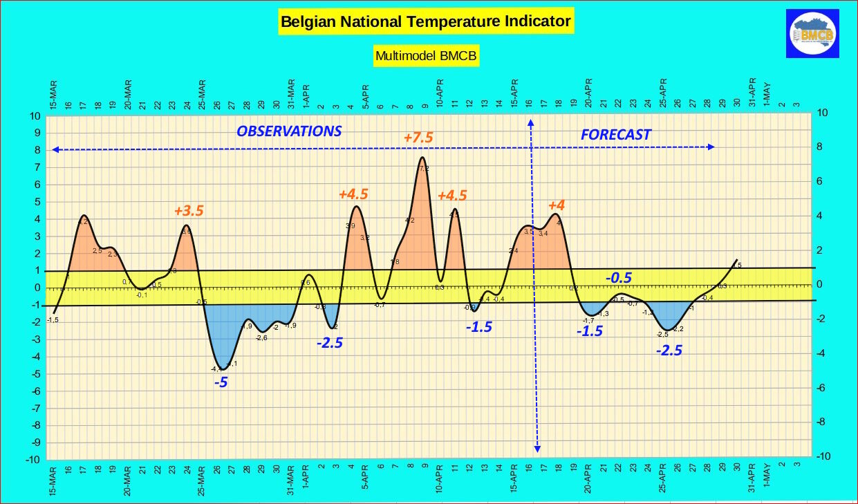 Deze verbetering blijft echter tijdelijk. Na 18 april keert de trend geleidelijk om, met een duidelijke daling van de thermische index tot waarden tussen 0 en -3, wat wijst op de terugkeer van frissere omstandigheden.