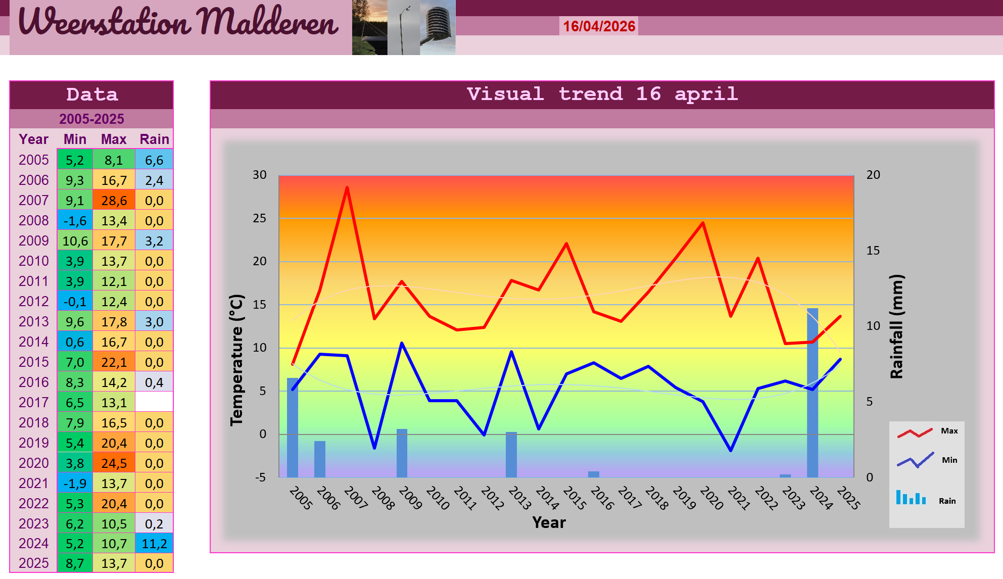Net als gisteren werd de dag weer aangevat onder azuurblauwe luchten en konden we starten bij erg hoge minima van 9,1 graden. Toch waren er kapers op de kust want hernieuwde hogedrukopbouw net ten westen van ons zorgde ervoor dat in de loop van de dag de wind resoluut het noorden ging opzoeken en er een forse afkoeling volgde. Deze gebeurtenis werd geruime tijd daarvoor reeds ingeleid door het zeer melkachtig kleuren van de lucht door een soort van nevel die voor de zon weliswaar weinig hinder opleverde, maar wel de blauwe kleur van de lucht bijna volledig deed verdwijnen. Het noordwesten van de Benelux werd reeds voor de middag met de "koelbloedige" ommezwaai van het weer geconfronteerd maar Malderen kon nog genieten van de subtropische warmte (met maxima van 28,6 graden) tot omstreeks 17H toen ook hier de wind flink opstak en het kwik aan een acrobatische duik begon. De enige neerslag die hier viel was afkomstig van duizenden witte blaadjes van de Japanse kerselaars die er door het plots aanzwellen van de west- noordwestelijke wind tot 29,0 km/h met massa's tegelijk werden afgerukt. Een erg sfeervolle gebeurtenis, die door de eigenaars van vijvers en openluchtzwembaden echter minder werd geapprecieerd. De wind nam vrij snel weer af in kracht maar de temperatuursdaling ging onverminderd verder waardoor het tijdens de avond ronduit kil aanvoelde. Vanuit het westen verschenen kort voor zonsondergang wat sluierwolkjes, maar voor dit etmaal bleef het daarbij en konden we de dag rustig afsluiten.