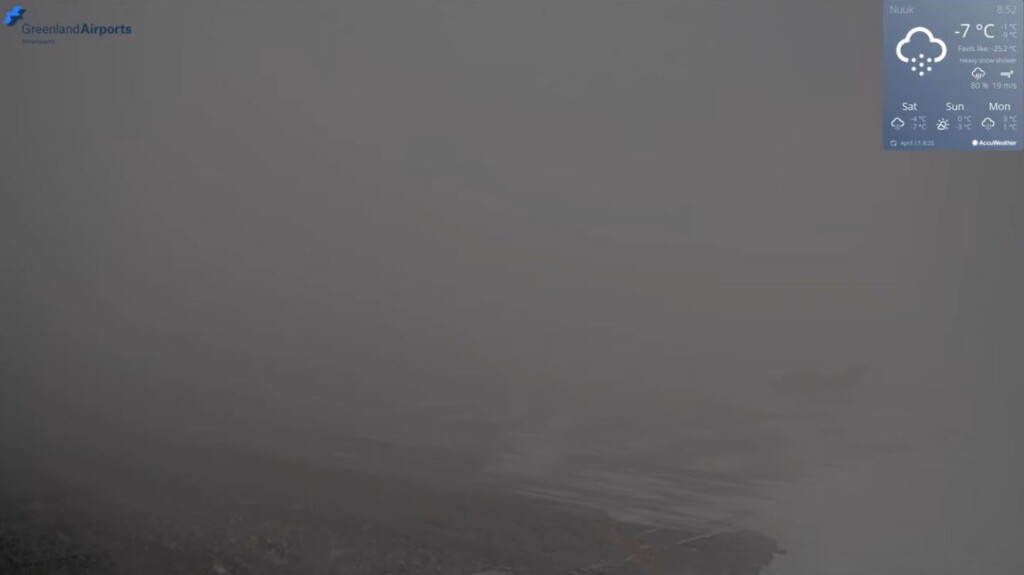 Het zicht is door zware sneeuw nu bijna tot 'nul' gereduceerd en de temperatuur is gedaald naar -7 graden... Zie de screenshot van de webcam.