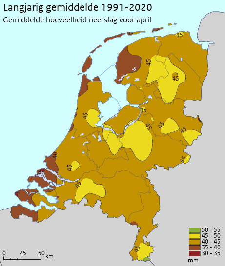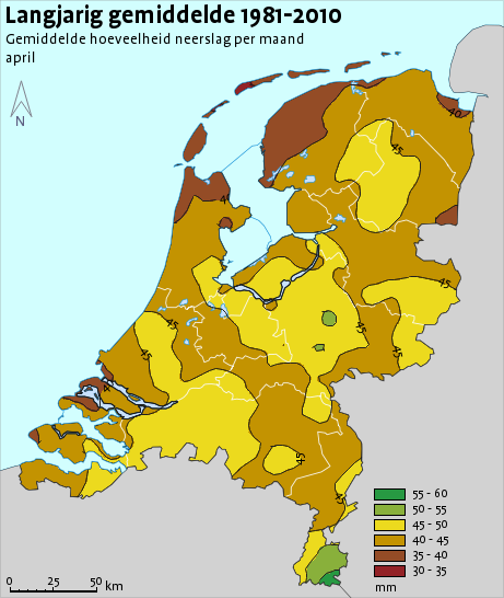 Neerslag in april is tussen deze twee klimaatperioden wat afgenomen.