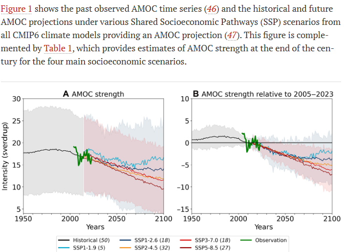 Volgens de standaard klimaatmodellen (CMIP6, scenario SSP2-4.5) zal de AMOC tegen het jaar 2100 met 32 ± 37% in kracht afnemen. De onzekerheidsmarge in deze berekening is dus erg groot.