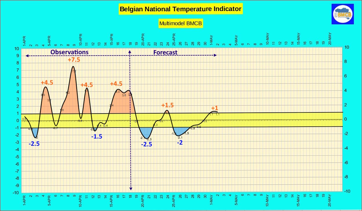Deze zachtere fase blijft echter van korte duur, want rond 26 april zakt de index opnieuw tot ongeveer -2, met maxima tussen 9 en 15°C.