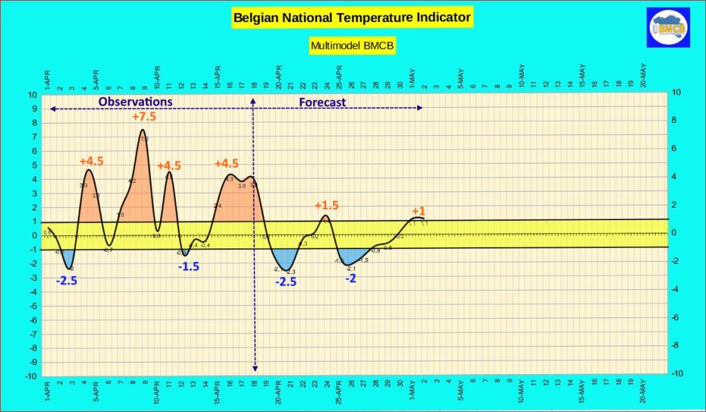 Vanaf dit weekend zet een duidelijke afkoeling in. De nationale thermische index voor België zakt opnieuw naar negatieve waarden, met rond 20 en 21 april niveaus van ongeveer -2 tot -3, wat een merkbare frisheid betekent. De middagtemperaturen blijven in die periode meestal beperkt tot 8 à 15°C.