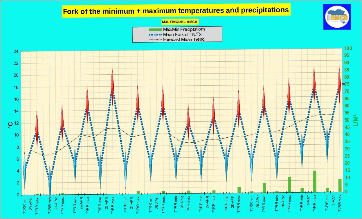 Vanaf 28 april lijkt een meer wisselvallige evolutie zich af te tekenen. Regenzones en buien worden frequenter tot begin mei, terwijl de temperaturen geleidelijk stijgen. Rond 1 mei wordt het zachter, ondanks een aanhoudend licht onstabiel weertype.