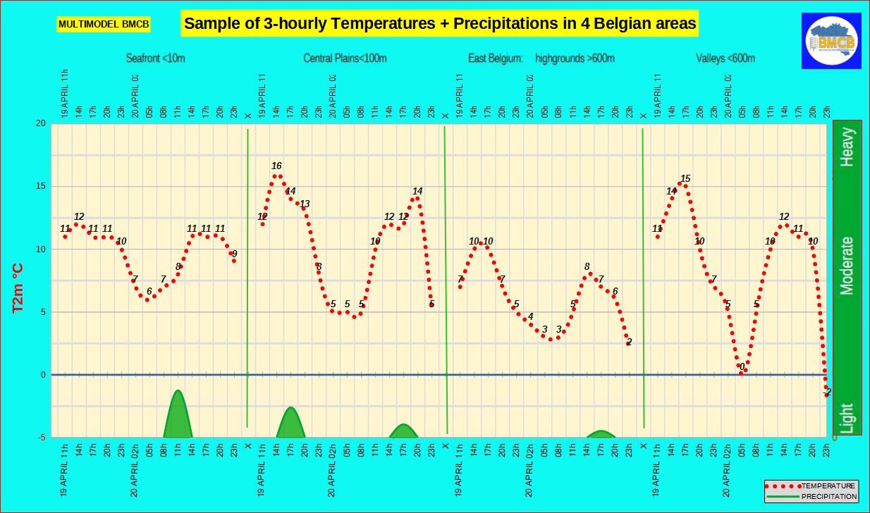 Tegen de avond wordt het meestal licht bewolkt. Rond 21 uur liggen de temperaturen tussen 9 en 10°C aan de kust, 7 tot 11°C in het binnenland en 4 tot 8°C ten zuiden van Samber en Maas, met lokaal 3 tot -2°C in de valleien. De wind blijft zwak tot matig uit noord tot noordoost.