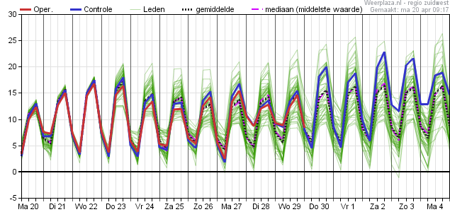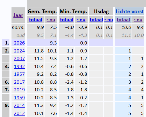 Rotterdam Airport staat nog altijd op nul vorstdagen deze lente, met als laagste waarde precies 0,0 graden op 29 maart. Het enige jaar met ook geen enkele vorstdag van 1 maart t/m 20 april was twee jaar geleden (2024), maar toen werd het op 23 april nog -1,1 graden. Gezien de huidige pluim lijkt de kans vrij groot dat het daarmee de eerste vorst-vrije lente ooit gemeten wordt in Rotterdam, sinds ten minste 1957.