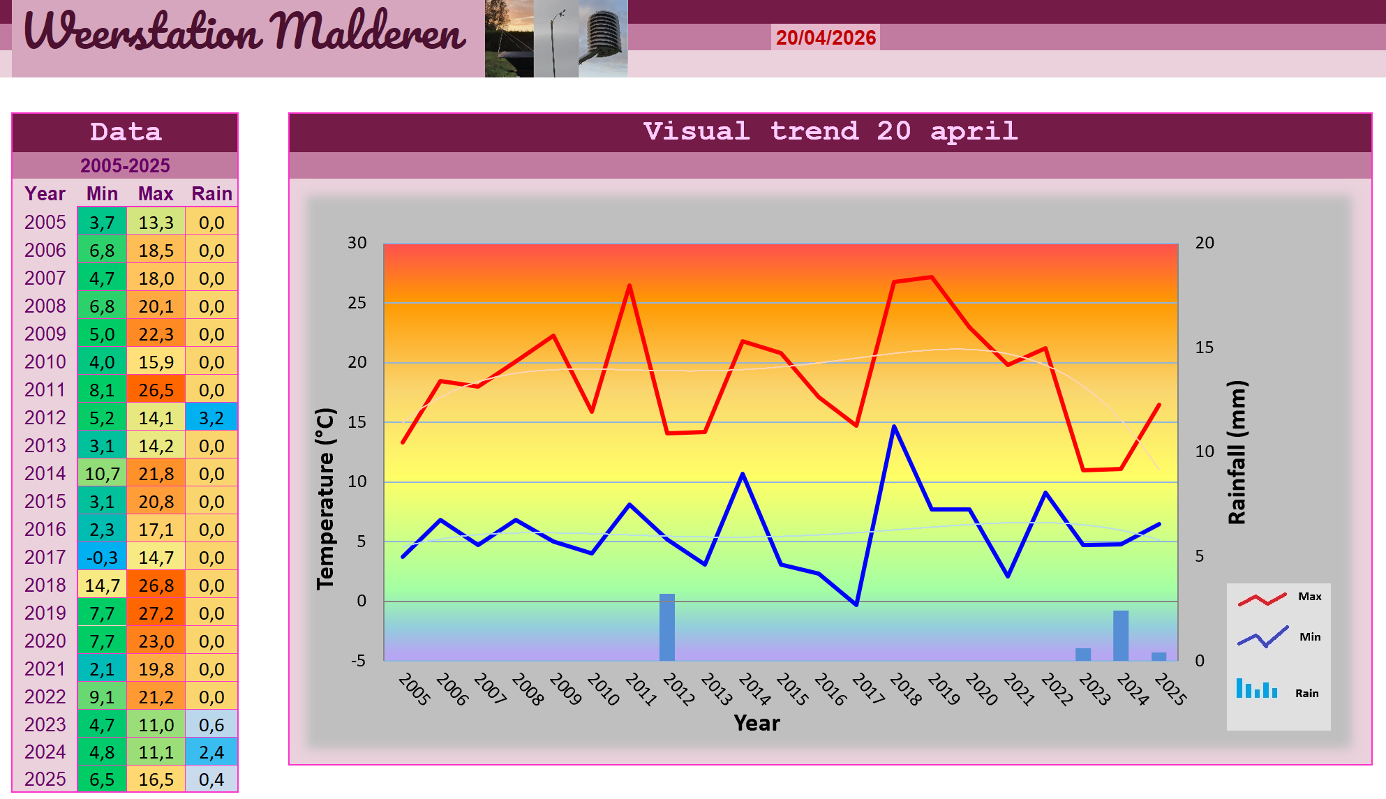 De depressie is tijdens de nacht dichterbij gekomen, en dit vertaalde zich in chaotisch aandoende bewolking waarin onstabiliteitsverklikkers te zien waren zoals floccus en castellanusachtige formaties. Het is daarbij afgekoeld tot 6,5 graden en er werd wat dauw gevormd in de windstille en vochtige lucht. De uren daarop werden gekenmerkt door deze bewolking waardoor het erop leek dat er buien in aantocht waren. Er leek op die hoogte ook een zuidoostelijke stroming te staan maar aan de grond was de wind zuidelijk tot zelfs zuidwestelijk. Tussendoor was er wel veel ruimte voor de zon, op sommige momenten was het maar voor 1/8 bewolkt en de wind was ook wat zwakker dan gisteren waardoor het aangenaam toeven was buiten met die krachtige aprilzon erop, ondanks de niet al te hoge maxima van 16,5 graden. Halverwege de namiddag pakten dreigende wolken zich samen in het zuidwesten waarbij ze zich organiseerden in een lijn die geflankeerd werd door fraaie Altocumulus lenticularis wolkjes. Even voordien waren er in die richting ook al verijzende toppen van buienwolken zichtbaar. Er kwamen ook al snel meldingen van buien binnen al bleek het in Malderen beperkt te blijven tot een paar verdwaalde druppels. Na passage van deze lijn zagen we erg indrukwekkende Altostratus undulatus asperitas wolken verschijnen en daaruit vielen na een tijd ook weer af en toe verdwaalde druppels. Het bleef zwaarbewolkt tot betrokken en bij momenten kregen we lichte regen die echter amper voldoende was om de straatstenen nat te maken. Later op de avond kwam het dan toch tot een iets zwaarder regenbuitje dat zelfs meetbaar was met 0,4 mm. Daarna waren het terug verdwaalde regendruppeltjes die af en toe vielen, uit een erg indrukwekkend wolkendek met golvende structuren. De rest van de avond verliep rustig, klam en vochtig na het intreden van de duisternis, de neerslag die toen nog viel was niet meer meetbaar waardoor dat buitje eerder deze avond het volledige dagtotaal met zich meedroeg.