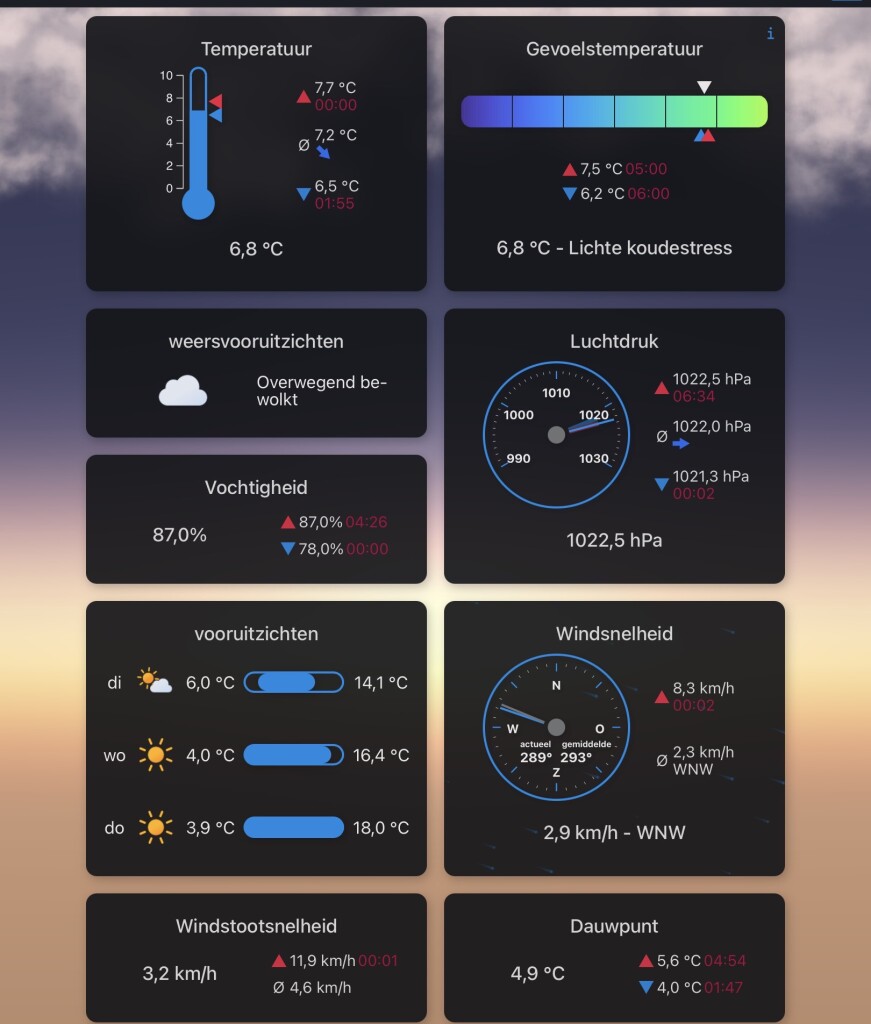 Goedemorgen, Tact 5.2°, grijs, MZ, N-wind, 1022 hPa. Zou me niet