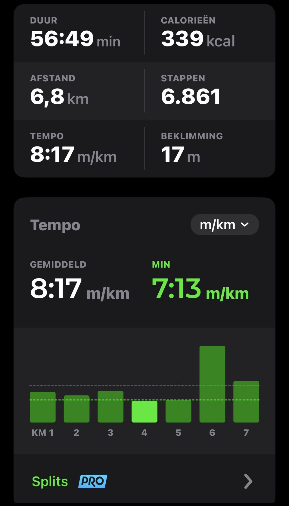 In totaal komt er nog ruim 700m bij want ik had mijn mobiel vergeten aan te zetten in t begin. Dus ik heb zo een 7,5KM gelopen binnen een 1 uur en 5 minuten. Dus ik heb flink doorgewandeld. ![]()