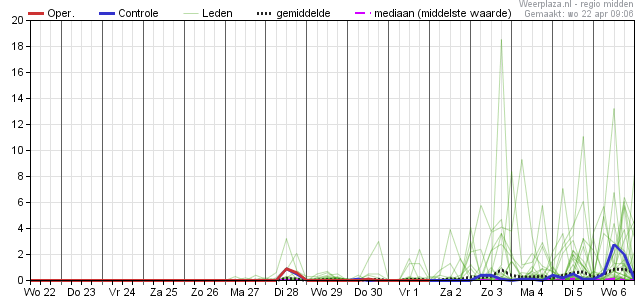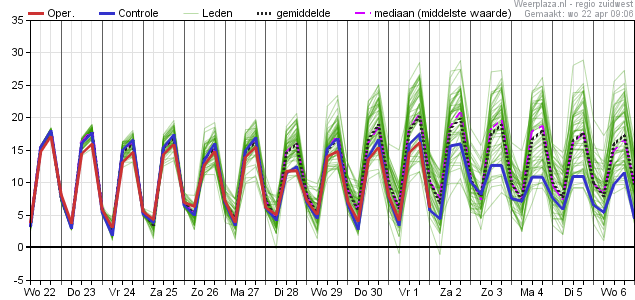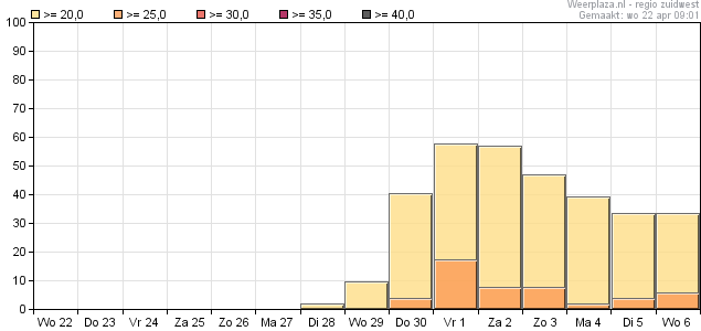Neerslagkansen de komende 10 dagen zijn zo goed als nul, en stellen ook daarna niet veel voor. Verder (heel) veel ruimte voor de zon. Kansen op warme dagen nemen voor het zuid(west)en richting begin mei toe naar ruim 50%, en daarbij kan EC de temperaturen af en toe ook nog wel iets onderschatten. Overdag doorgaans in ieder geval buiten de beruchte VnV-zone.