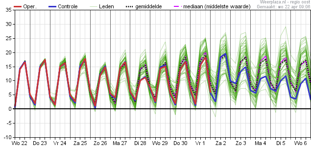 Daar zie ik geen afkoeling richting vrijdag... Heeft te maken met zwakke wind uit noordelijke richting, die afkoeling geeft in vooral het noorden en noordwesten. De Bilt koelt dan ook iets af, maar oosten en zuidoosten dus niet.