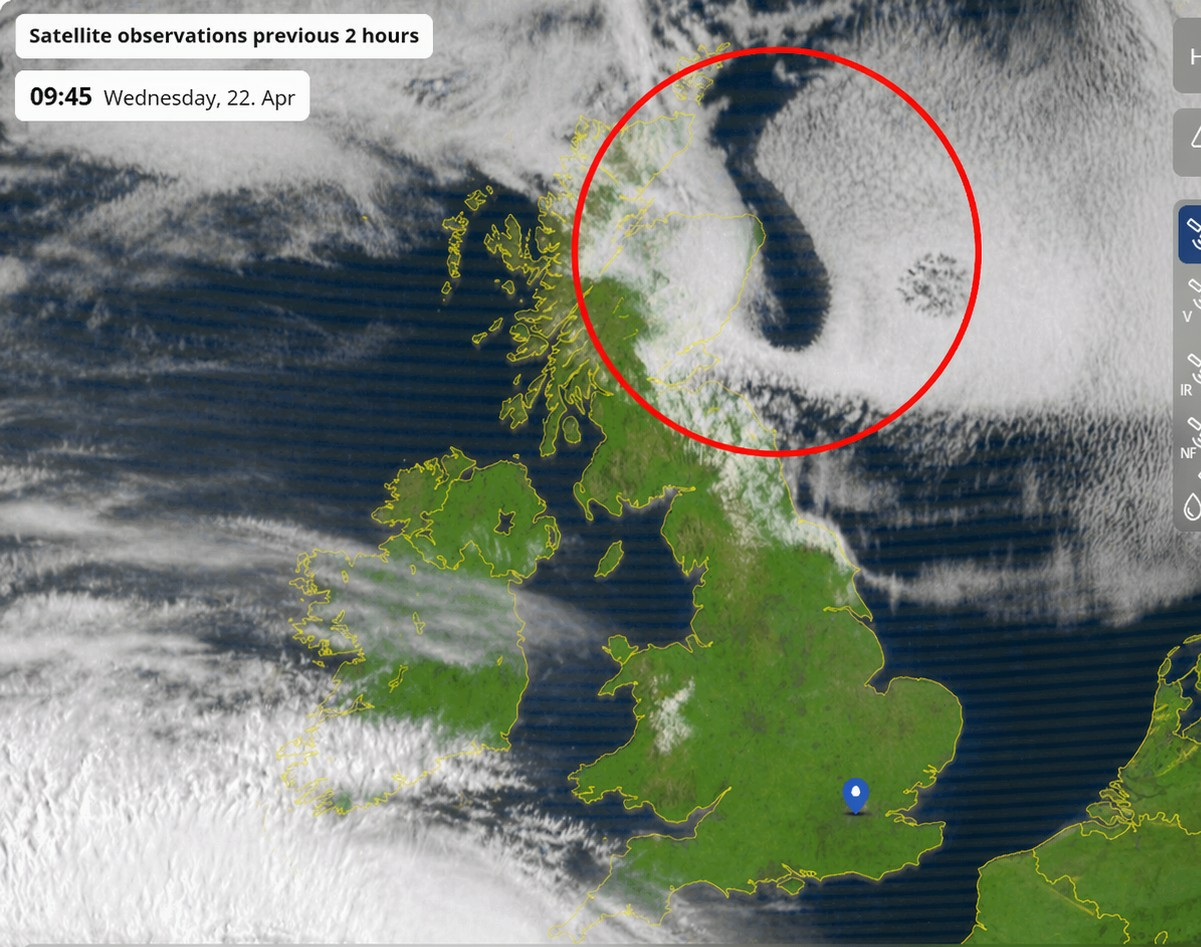 Wat mij hier vooral opvalt, is de opvallende, langgerekte opklaring binnen een verder aaneengesloten wolkendek.