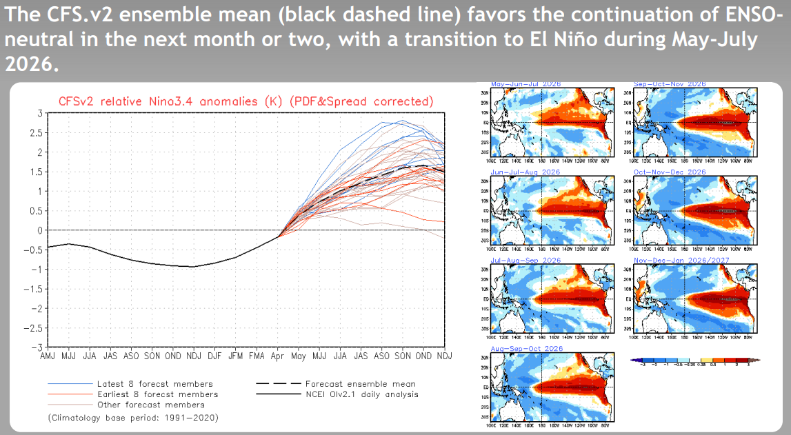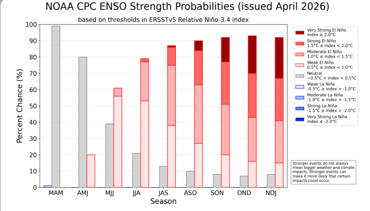 Het nieuwste NOAA-rapport van 20 april toont een 50% kans op een sterke El Nino of meer en ongeveer 25% kans op een zeer sterke El Nino. Ik weet niet of de kansen vergroot zijn vergeleken bij de update van een maand geleden, maar een zekerheidje is het absoluut nog niet dat het een super-El Nino gaat worden.
