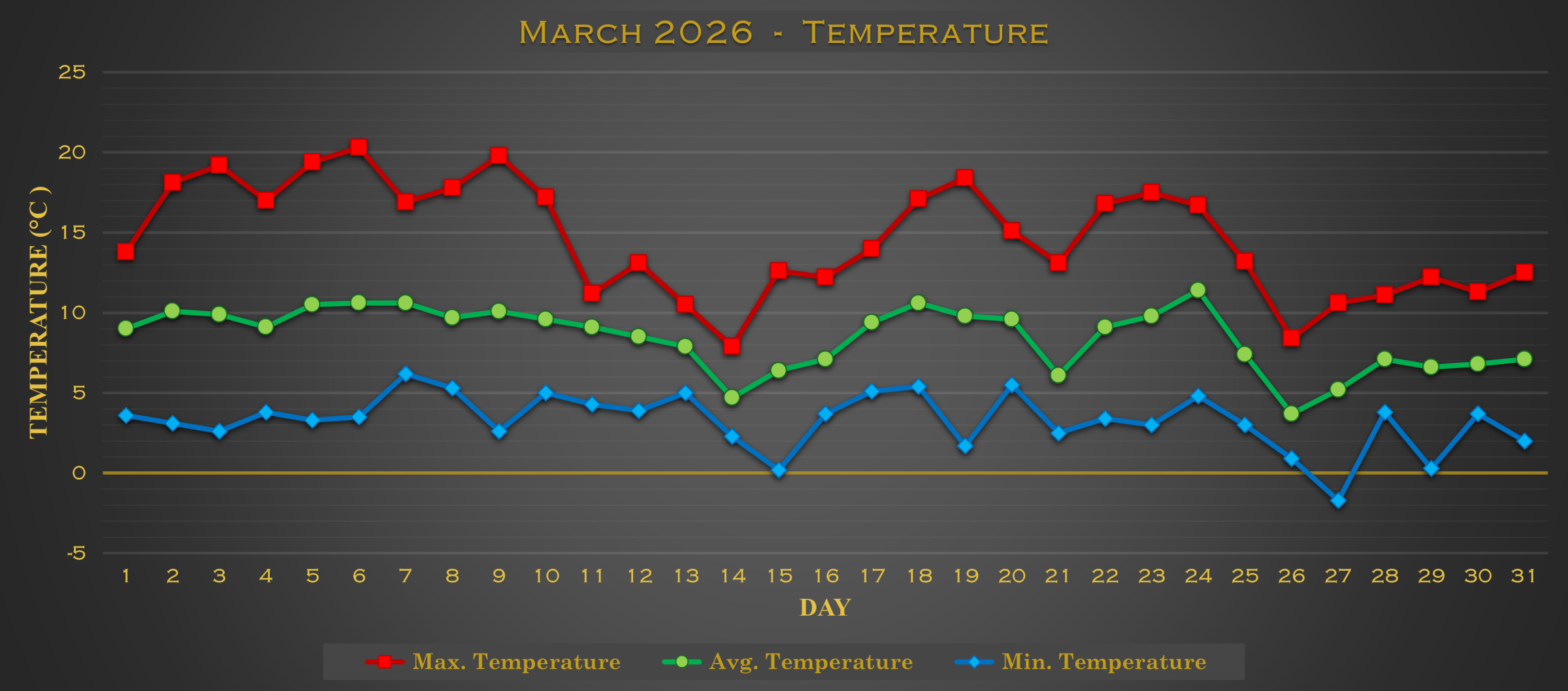 Opvallend is wel dat de minimumtemperatuur op de meeste dagen ondanks de erg lage hoeveelheid vorstdagen toch heel keurig tussen de 0°C en 5°C bleef!