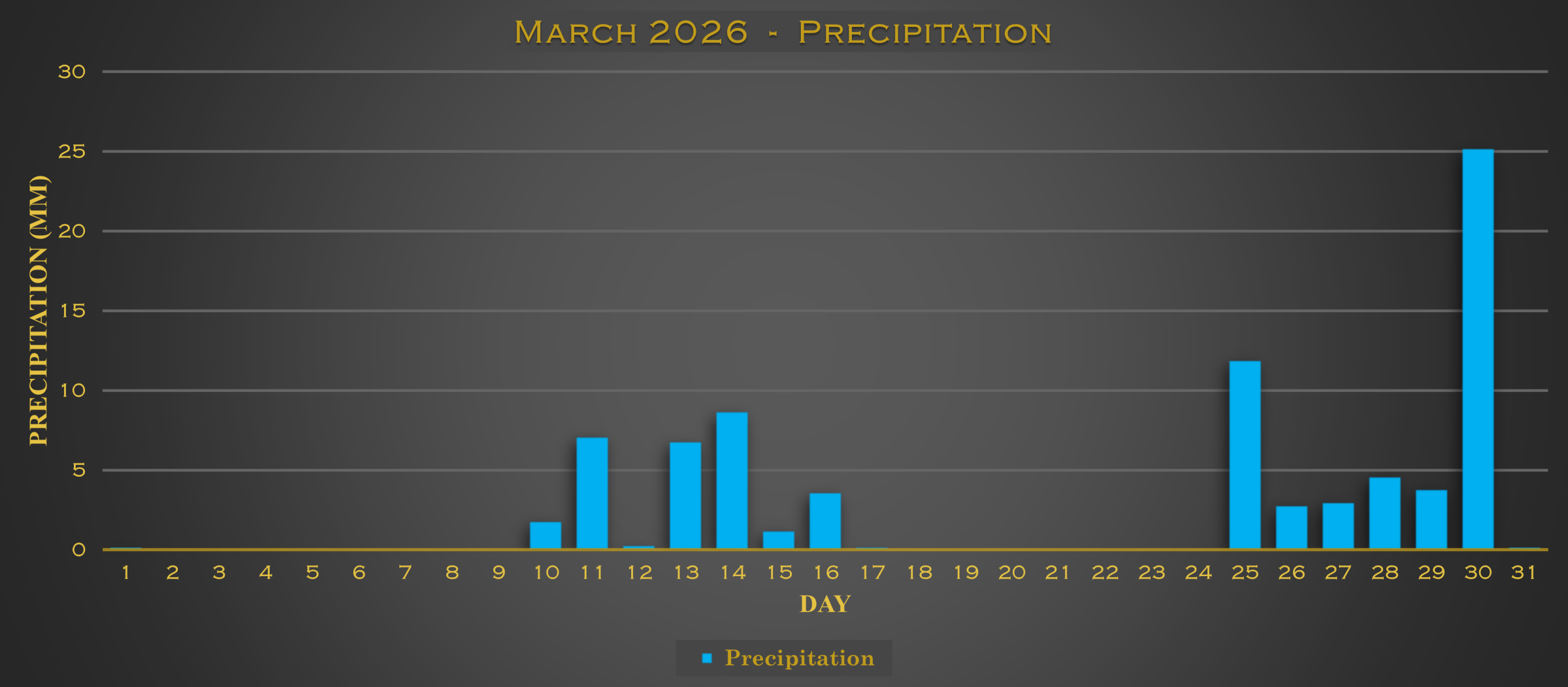 Er waren duidelijk twee nattere periodes welke de eerste van 10 t/m 17 maart duurde en de tweede van 25 maart t/m 1 april. De rest van de dagen verliepen droog met uitzondering van 1 maart waar toch nog een schamele 0,2mm naar beneden kwam vallen.