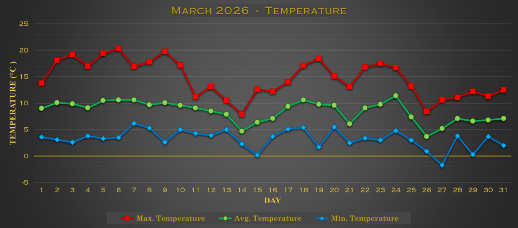Ik meet zelf (nog) geen zonuren en hiervoor kijk ik dus naar KNMI-station Deelen, deze kwam op 217,2 uren uit en is daarmee ruim voldoende voor een derde plek van de zonnigste maartmaanden ooit gemeten. Alleen 2022 en 2025 staan (zelfs ruim) boven dit jaar.