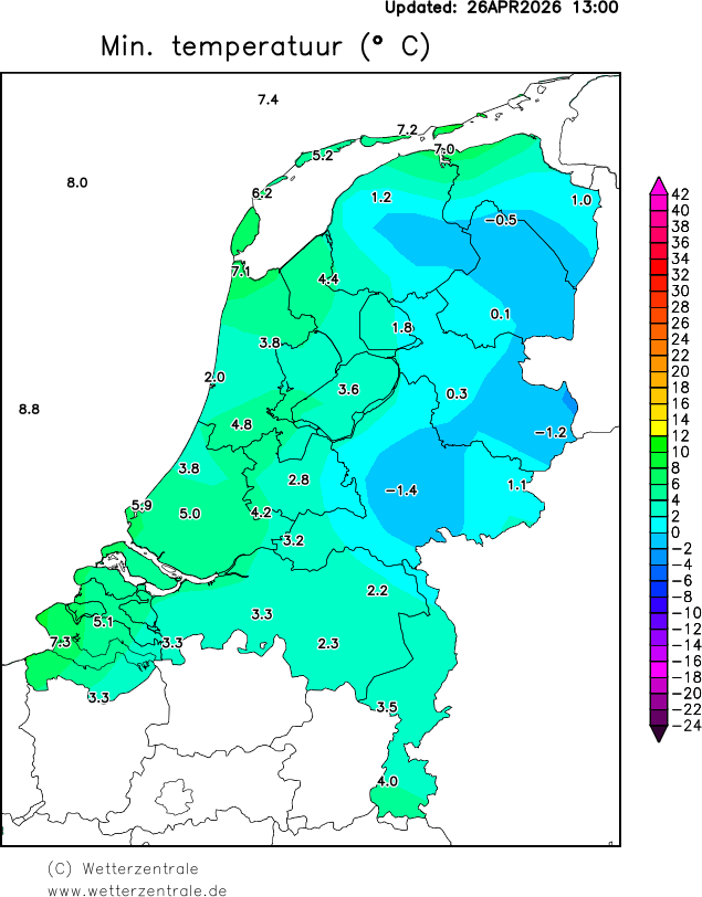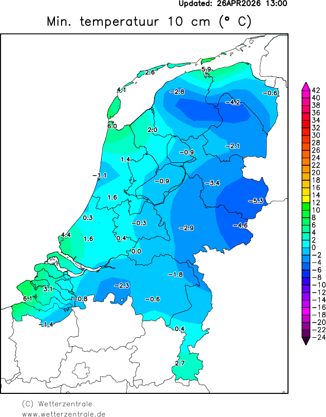 De vraag is hoe kan het dat bijvoorbeeld aan de grond bijna matig vriezen naar geen vorst op 1.5 meter hoogte (Hupsel) en op een andere plek het op 10 cm hoogte een paar graden vriest maar ook op 1.5 meter (Deelen).