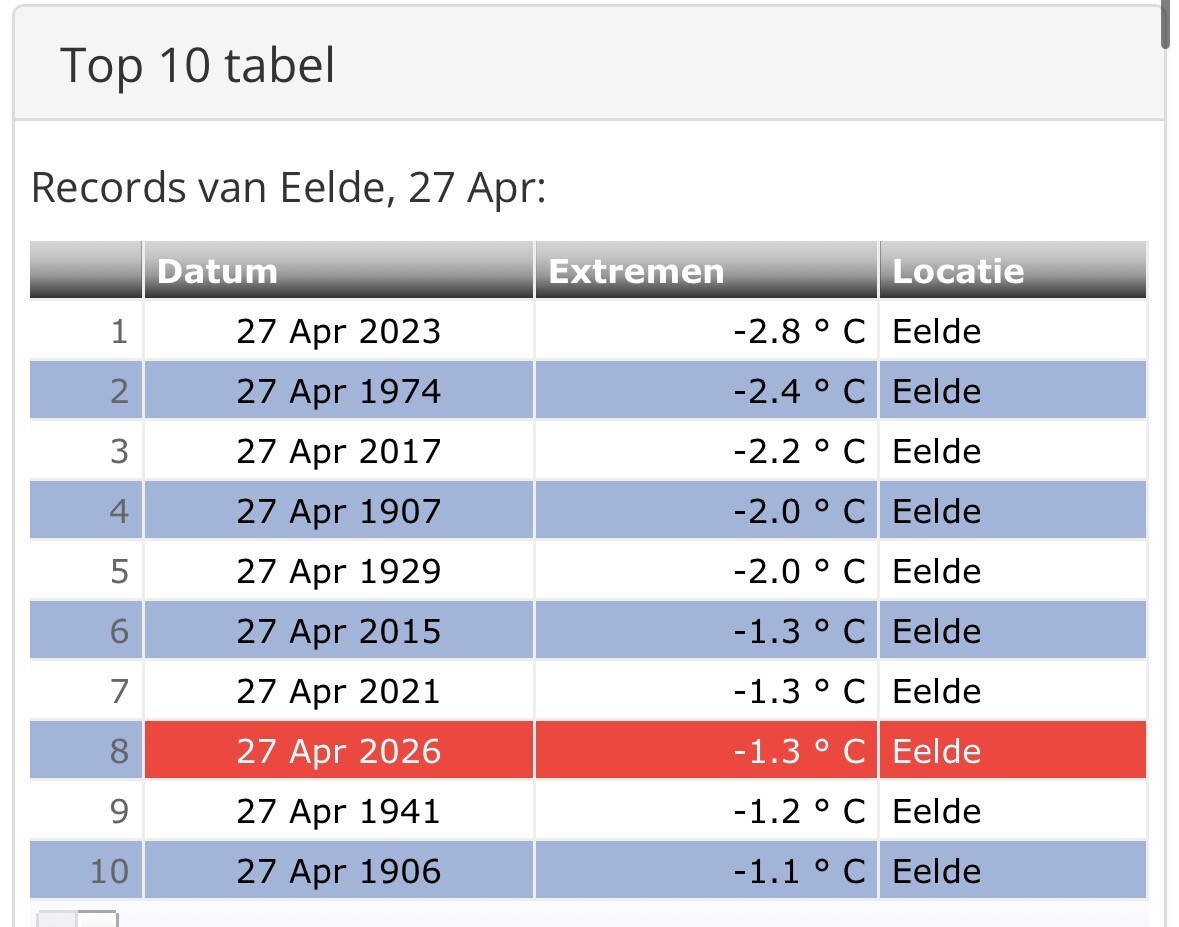 Je ziet tegenwoordig niet vaak dat op stations met lange historische reeksen een groot aanral van de kouderecords in de huidige eeuw zijn gezet. Ook dit jaar een top 10 notering voor Eelde.