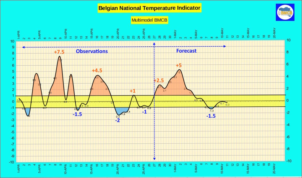 Na een koelere periode zal de nationale thermische index in België de komende dagen duidelijk stijgen en een piek bereiken aan het begin van het weekend van 1 mei, met een waarde rond +5. Dit gaat gepaard met een duidelijke opwarming, met maxima tussen 19 en 26°C in het hele land.