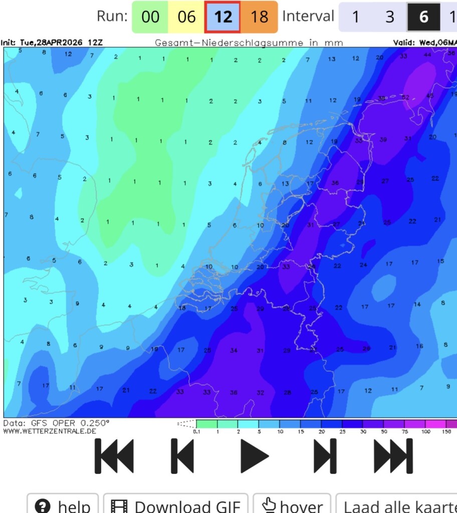 bij gfs is de regen verschoven van het westen naar meer centraal / oosten waardoor er bijna geen regen meer staat in onze buurt. Zal natuurlijk nog hopelijks wijzigen en morgen hopelijk weer iets meer naar het westen. Teveel vooruit kijken en hopen helpt toch niet, maar goed dat er wel wat variatie eraan komt in het weer. Ook al ben ik ook wel blij met de zon.