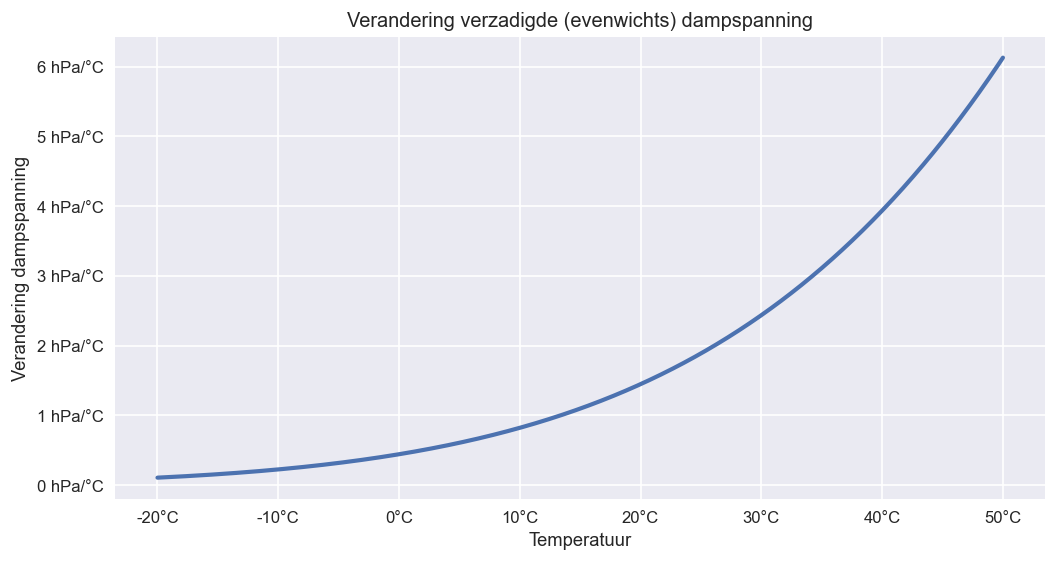 Als je bijvoorbeeld kijkt tussen 40 en 50°C dan verandert de dampspanning ongeveer 50 hPa. Oftewel rond 45°C neemt de dampspanning met 5 hPa toe per graad Celsius. Bij een temperatuur van -8°C is dat bijvoorbeeld slechts 0.26 hPa per graad Celsius.