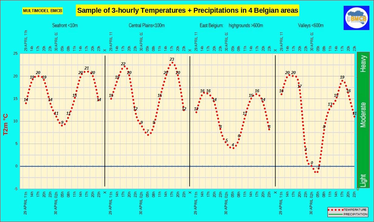 - Minima: ±9°C aan zee, 4–8°C in het binnenland, lokaal -1°C in valleien