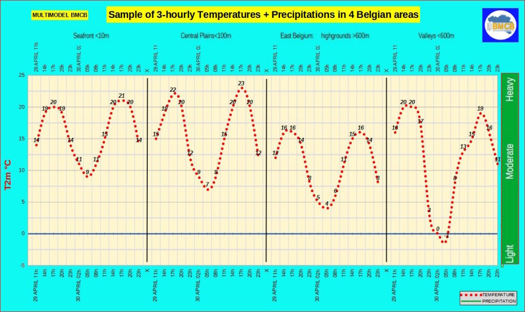 - Maxima: ±20°C aan zee, 20–22°C landinwaarts, 16–20°C in de Ardennen