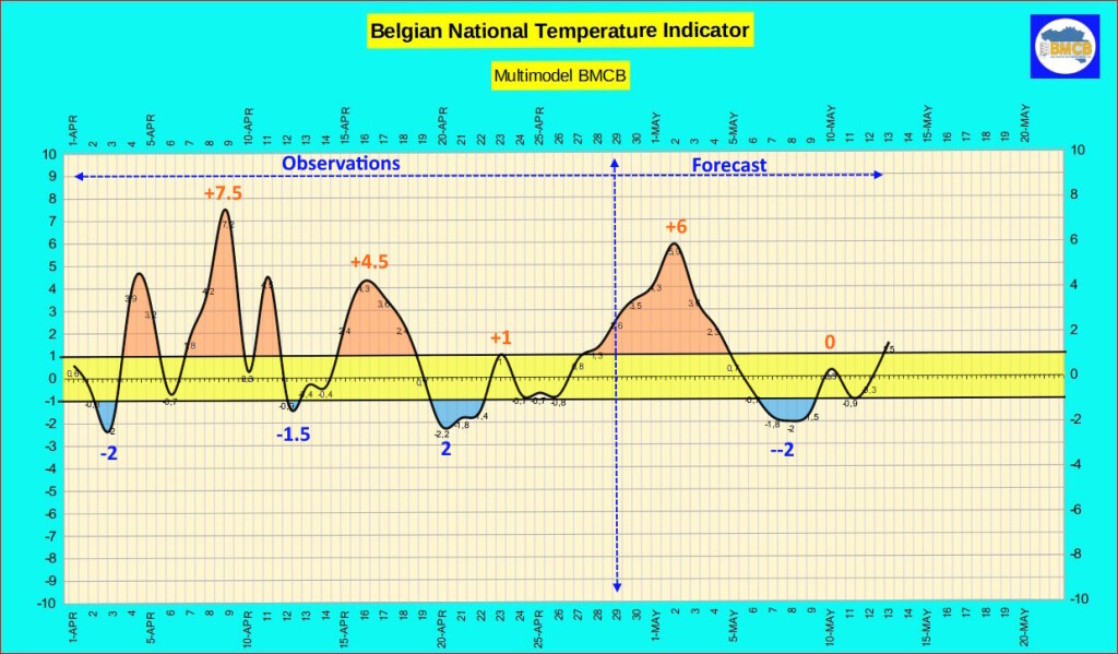 De Belgische nationale thermische index blijft stijgen en zal, zoals gisteren reeds voorzien, een piek bereiken aan het begin van het weekend van 1 mei, met een waarde rond +6. Deze evolutie zal zich vertalen in een duidelijke verzachting van het weer, met maximumtemperaturen tussen 20 en 26°C.