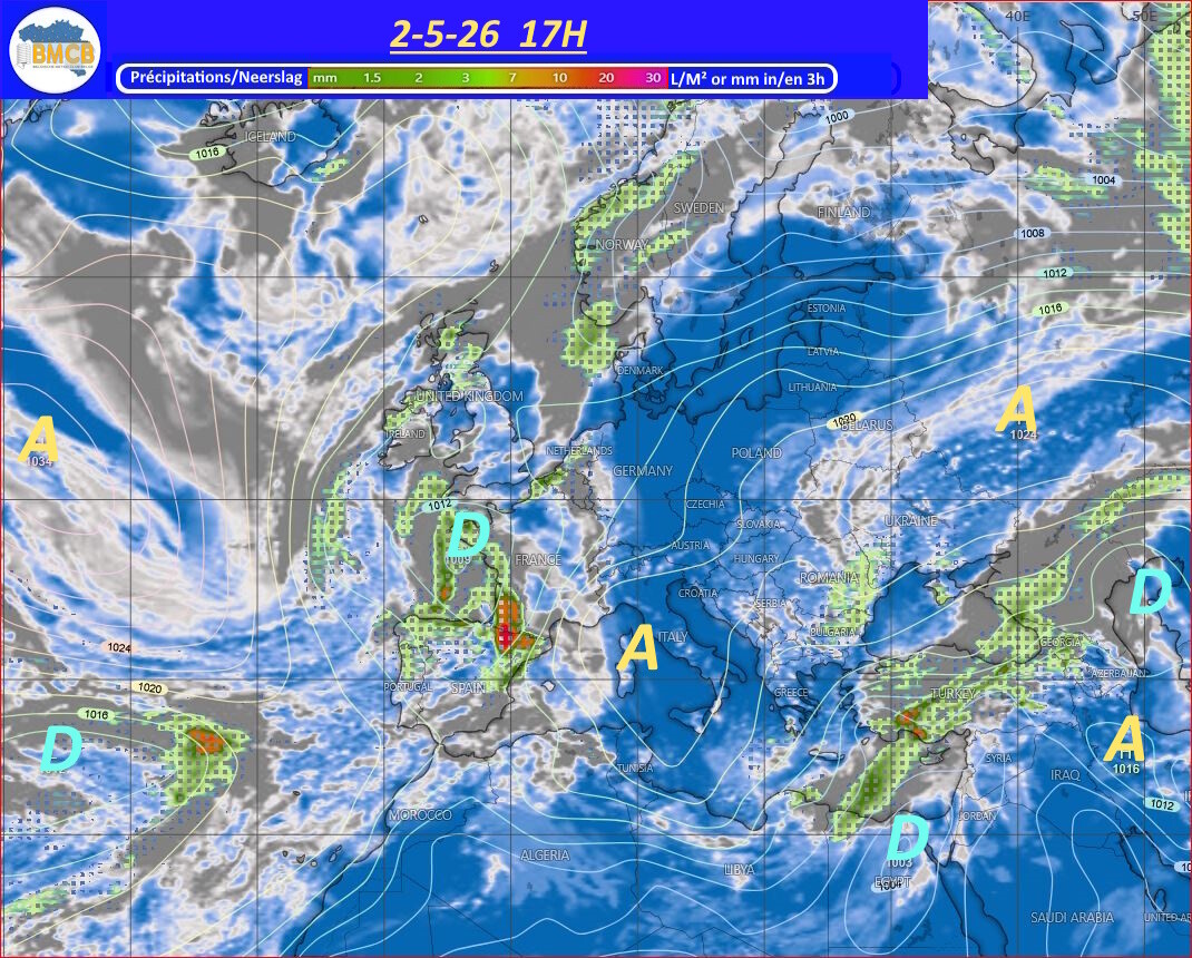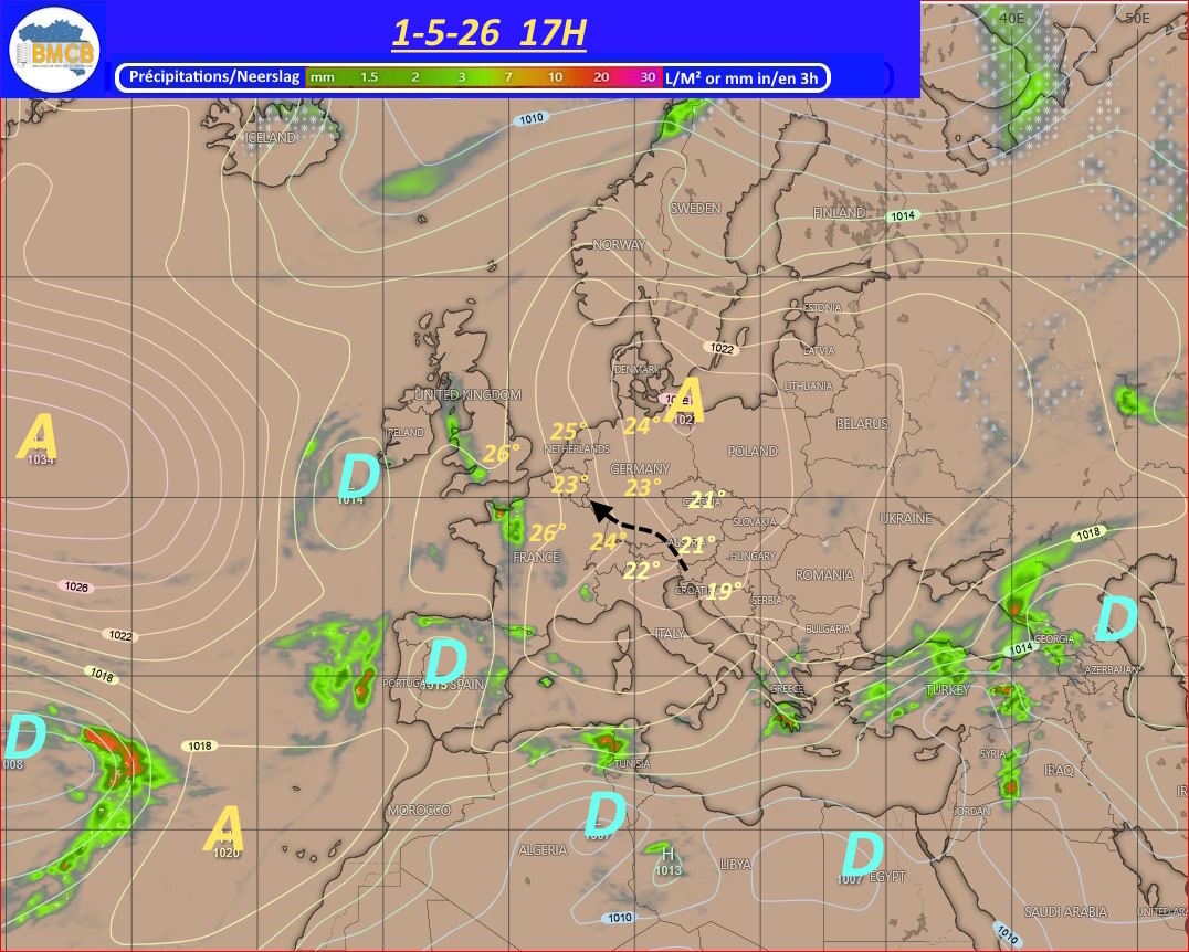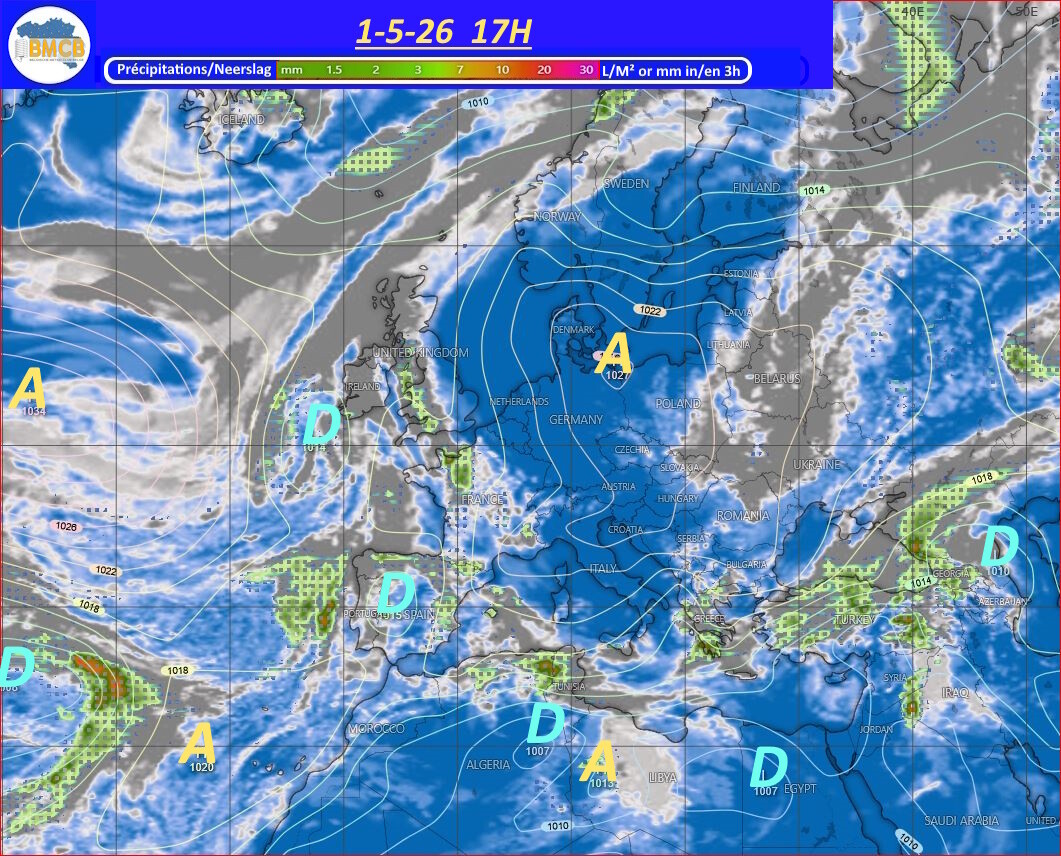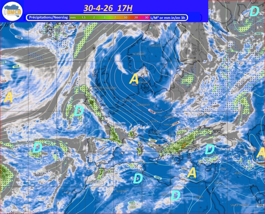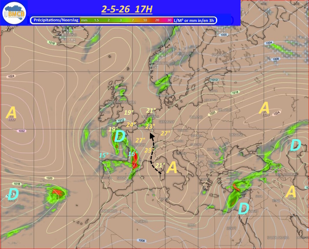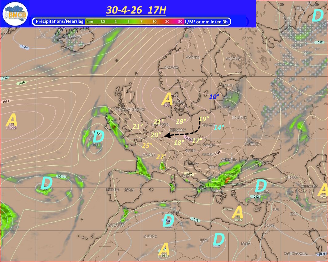 Het hogedrukgebied schuift geleidelijk naar het zuidoosten en zal zich zaterdag boven Oekraïne positioneren (ongeveer 1024 hPa). Aan de westflank wordt tegen het einde van de week warmere lucht van mediterrane oorsprong aangevoerd. Tegelijk nadert een onstabiele en onweerachtige zone, die het land in de loop van zaterdag bereikt.