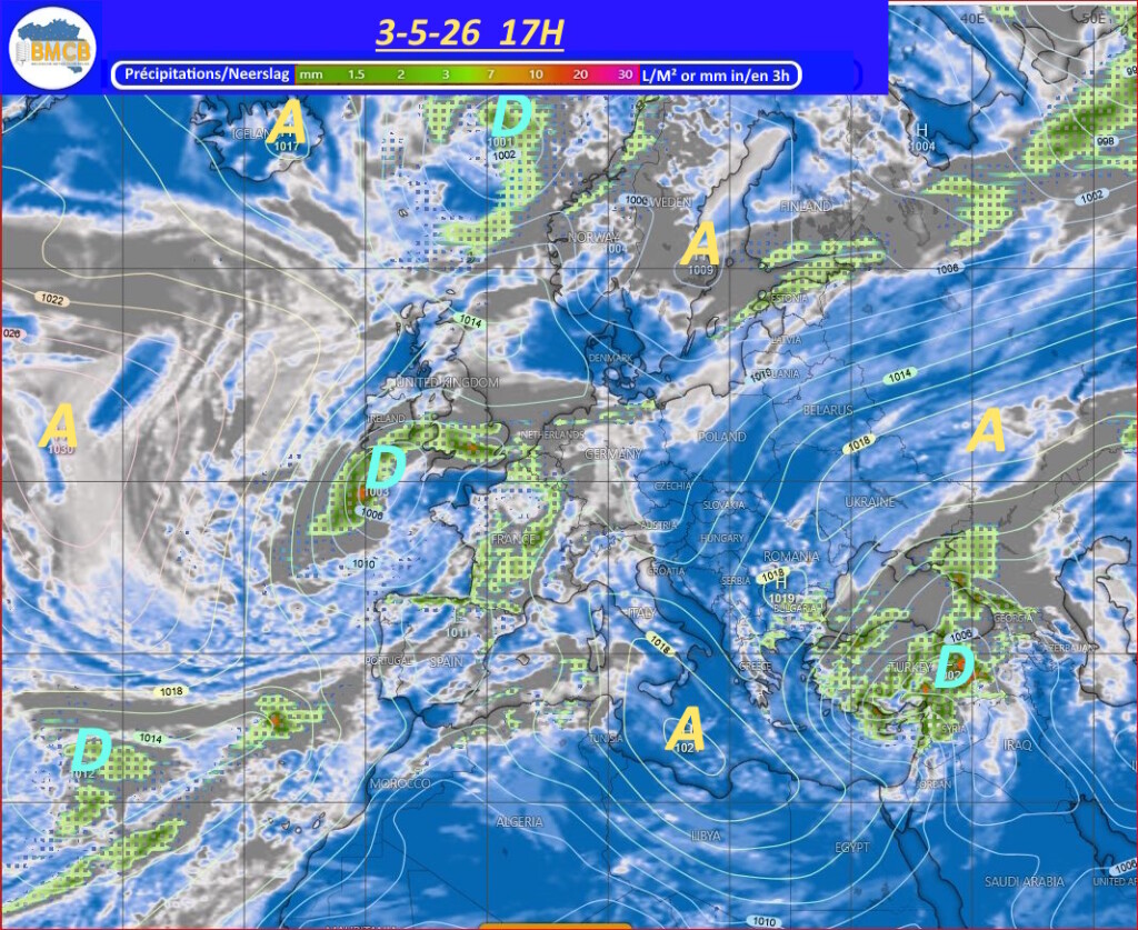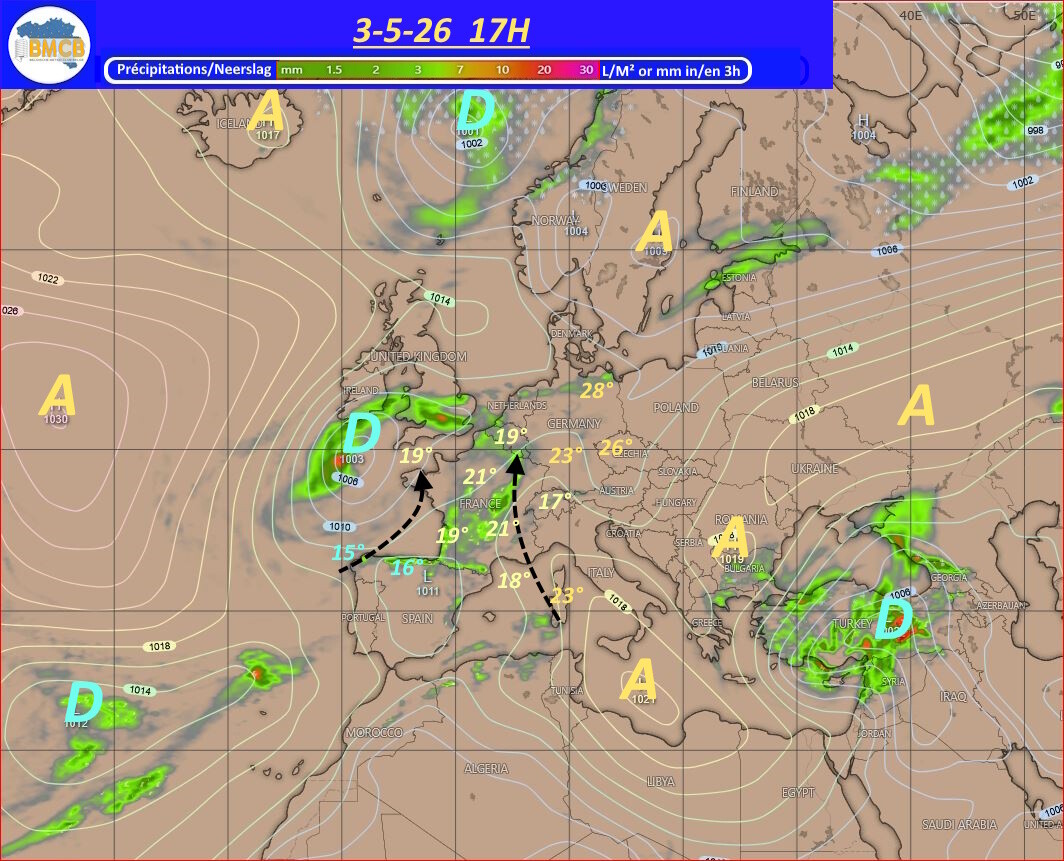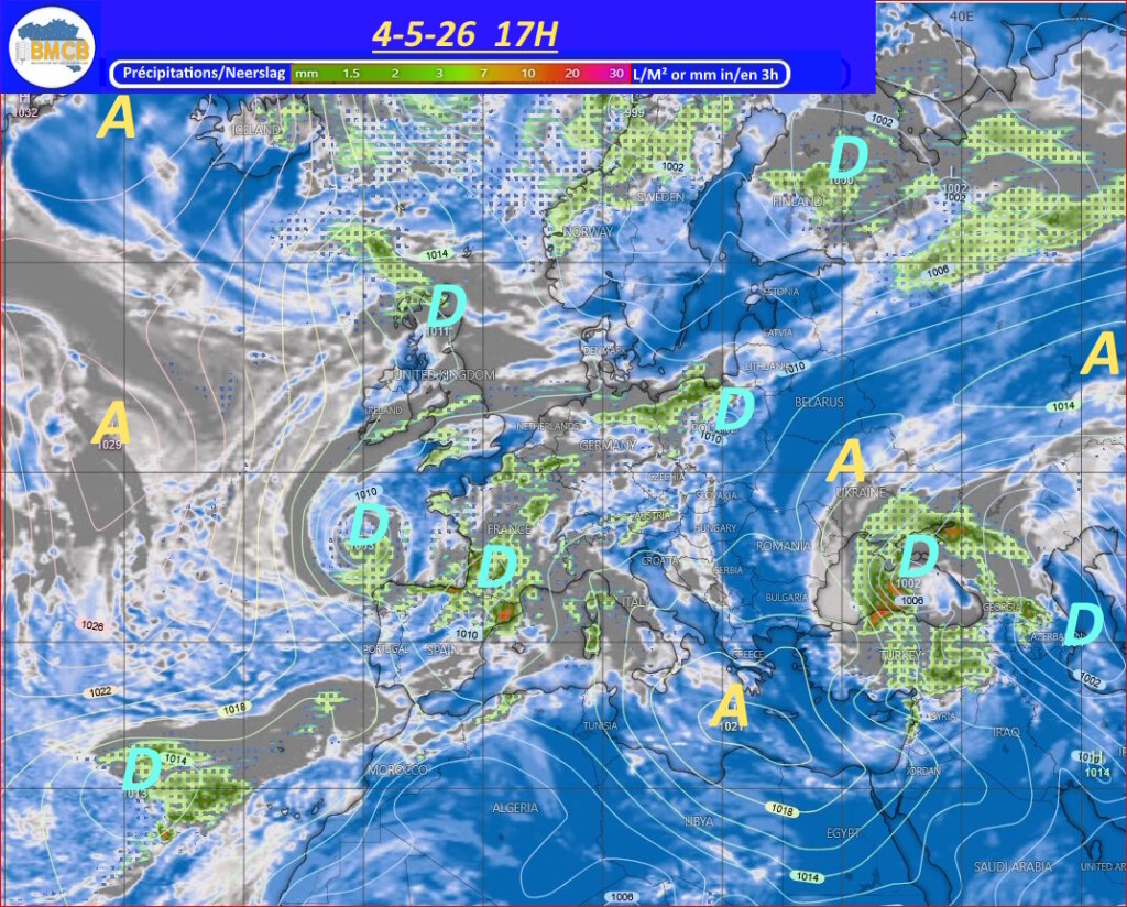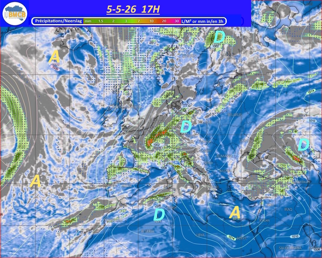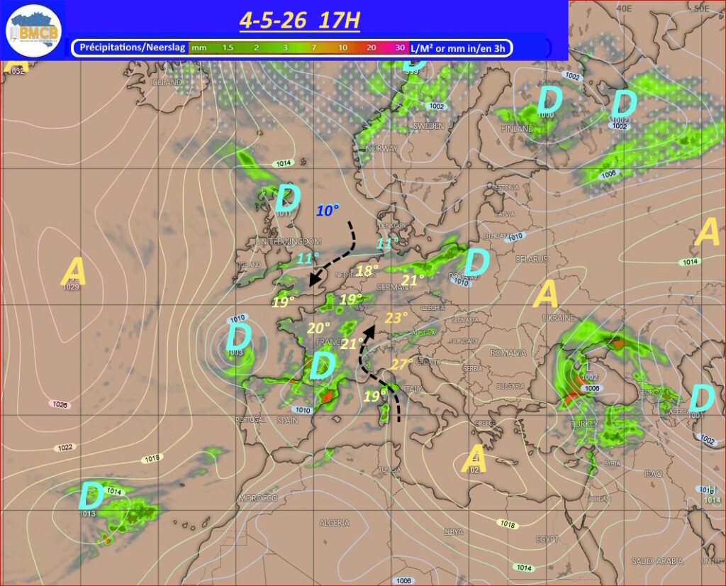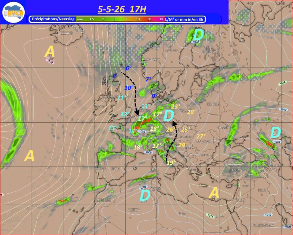 Deze evolutie hangt samen met een depressie boven Bretagne (ongeveer 1009 hPa), die een eerste onweerachtig front naar de Benelux stuurt. Op zondag volgt een tweede koufront met opnieuw onstabiel weer.