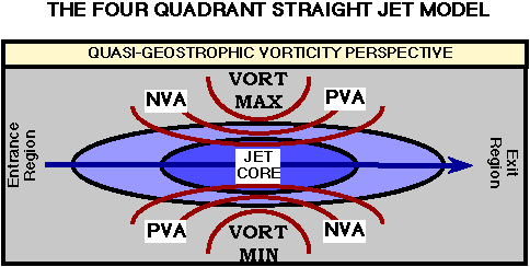 ter hoogte van de linkeringang hadden we dus convergentie. Vanaf de linkeringang neemt de vorticiteit af en treffen we dus negatieve vorticiteitsadvectie aan. Aan het andere eind van de jetstreak, ter hoogte van de linkeruitgang is er divergentie en is er positieve vorticiteitsadvectie.