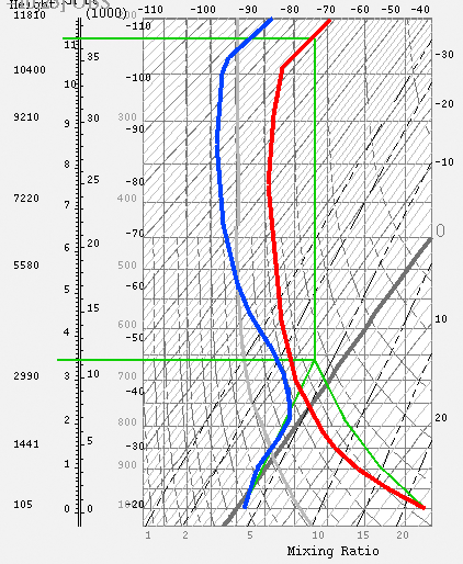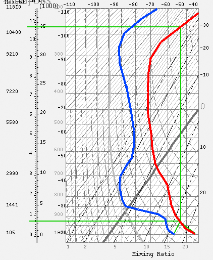 Het resulterende profiel na optilling van de droge luchtlaag zie je hieronder. De lucht is nu voorwaardelijk onstabiel van opbouw tot ruim 9 kilometer, terwijl dit eerst slechts tot 2 kilometer was.