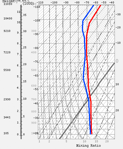 Het temperatuurprofiel helt in dit diagram in de onderste 1 à 1,5 kilometer rechts van de droogadiabaten, wat betekent dat de opbouw voor zowel droog-adiabatische als verzadigd-adiabatische processen onstabiel is. Dit wordt absolute onstabiliteit genoemd. Vaak komt absolute onstabiliteit maar over een hele dunne laag voor, alleen in gebieden met extreme instraling en opwarming (bijv. woestijnen) kan de lucht tot ruim een kilometer hoogte absoluut onstabiel van opbouw zijn. Vaak is de lucht dan echter ook erg droog waardoor buienvorming niet voorkomt. Soms echter, als er op enige hoogte wel genoeg vocht voorkomt, ontstaan er buien met een basis op enige hoogte ('elevated' of verhoogd) die dan door de sterke onstabiliteit behoorlijk zwaar kunnen zijn. Een bijkomend gevaar is dat de droge lucht onder de basis voor zware downbursts kan zorgen. De (fysische) werking van een downburst valt echter buiten de strekking van deze posting.