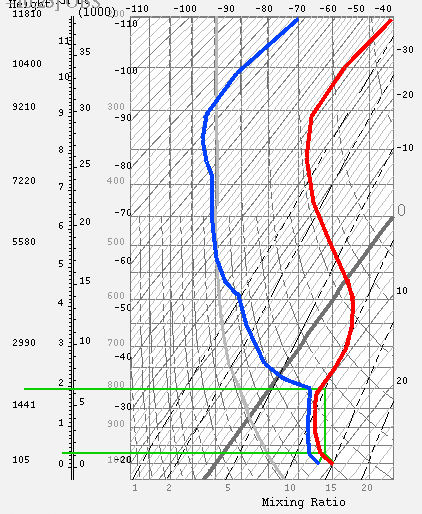 Deze lucht is in eerste instantie maar voor een klein gedeelte onstabiel van opbouw (voornamelijk de onderste paar honderd meter in dit geval) en onderin vrij vochtig. Daarboven bevindt zich echter een stabiele doch zeer droge laag. Als nu deze laag passief omhoog gebracht wordt (optilling) kan deze voorwaardelijk of zelfs absoluut onstabiel van opbouw worden.