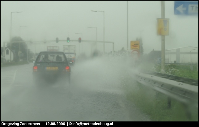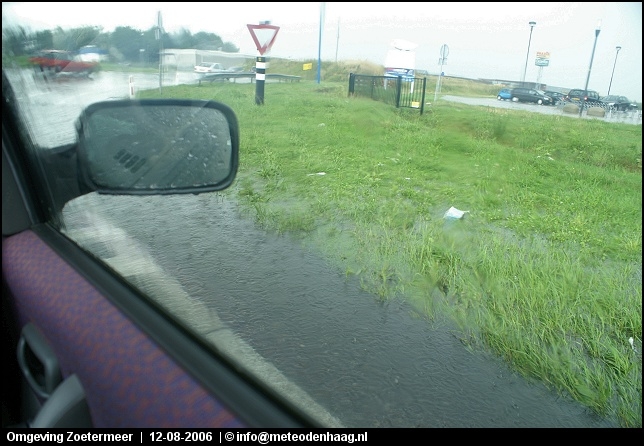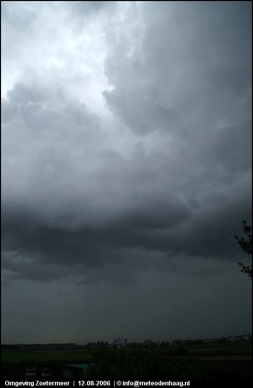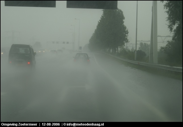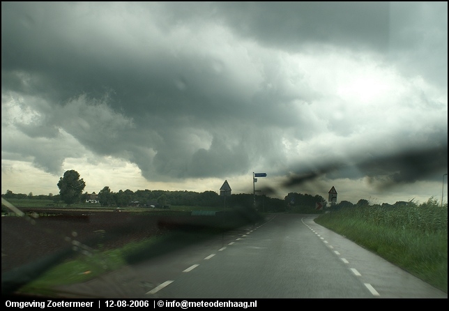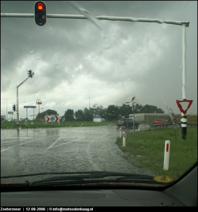 Rond 14u naar het oosten gereden omdat zich daar nieuwe cellen vormden. Eerst waren het nog fraaie single cells en ik hoopte een hoos te kunnen spotten. De cellen klonterden echter steeds meer ineens tot één grote multicell onweersbui, een echt watermonster. Vooral net ten O van Zoetermeer kwamen tientallen mm-ers regen naar beneden. Het zou met niets verbazen als er hier en daar >50mm is gevallen in een strook Rotterdam - Zoetermeer - Amsterdam.