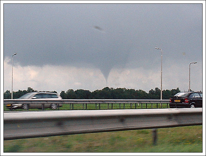 Daarna bleef de hoos voortdurend zichtbaar door de wonderlijk gunstige richting van de snelweg. De tweede foto toont het beeld enkele minuten later.