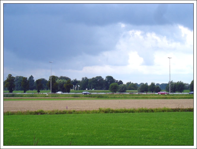Daarna namen we afslag Groningen/Meppel en dat was eigenlijk niet onze bedoeling. Nadat we vlug door Zwolle heen waren, besloten we direct na Zwolle te parkeren. Daar pas leek de hoos aan oplossing onderhevig. Het restant ervan is te zien op de vijfde foto.