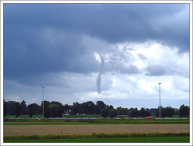 Gisteravond (Vrijdagavond) hebben wij (Dennis, Gijs en Roel, www.weersite.net) besloten om op waterhoosjacht te gaan op zaterdag. Roel en Gijs zijn Dennis eerst op gaan halen in Zeddam. Vervolgens zijn we via de A50 vanaf Arnhem naar het Noorden gereden. Vanuit de auto zagen wij vervolgens niet ver van Zwolle de prachtige hoos, die eerst waterhoos, daarna windhoos blijkt te zijn geweest. Helaas hebben wij lange tijd moeten rijden terwijl de hoos zichtbaar was, wat betekent dat de foto’s niet helemaal scherp zijn. Toch geeft het een aardig beeld. De hoos zagen we zo lang dat Roel en Dennis tientallen foto’s en een filmpje hebben gemaakt.