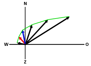 6 sterk in snelheid is toegenomen en geruimd is naar zuidwest. Indien we van bovenaf het trajectorie bekijken van een luchtdeeltje dat zich in deze atmosfeer verplaatst, dan zal deze de groene lijn volgen. Het deeltje gaat met de klok mee en maakt dus een anticyclonale beweging. De groene lijn wordt ook wel de hodograaf genoemd.