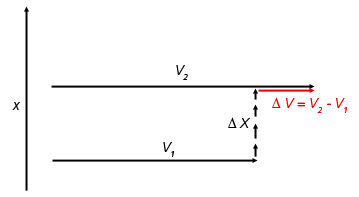 2 getekend met een willekeurig gekozen afstand ∆x. Voor de rest van het verhaal is enkel het verschil ∆v in vectoren van belang, om preciezer te zijn het snelheidsgradiënt ∆v/∆x.